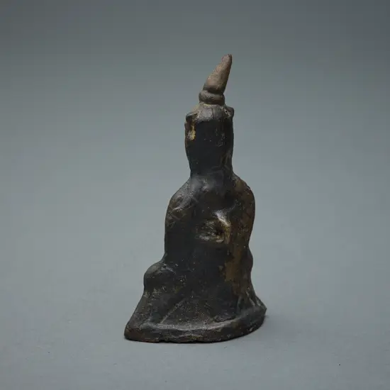 Seated with distinctive pointed headdress. Loop to back. H.8cm