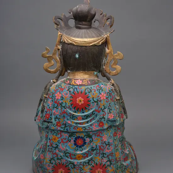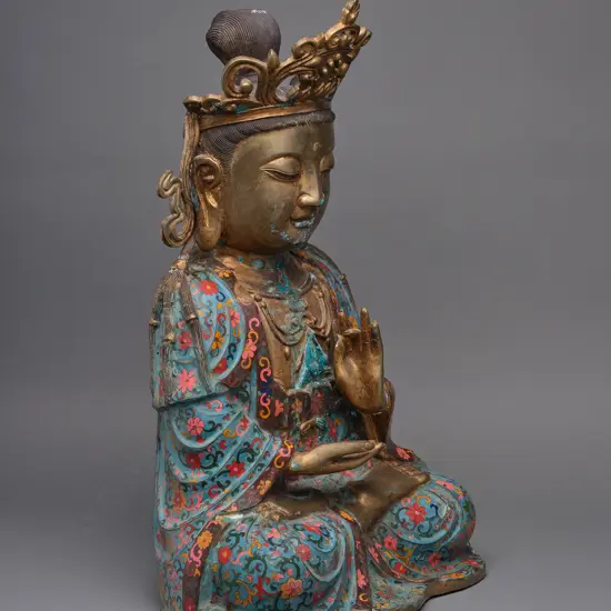 a Gautama Buddha figure of bronze alloy, enamel and gilt, late Qing Dynasty. The crowned and robed Gautama Buddha seated in Dhyanasana. The head with a top knot and elongated lobes; the face with a meditative expression; his left hand held in an Abaya (protection) mudra; his right in a Dhyana (meditation) mudra. China, c.1900. H. 565 cm. Acquired from David Auburn