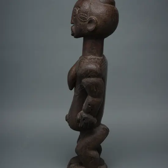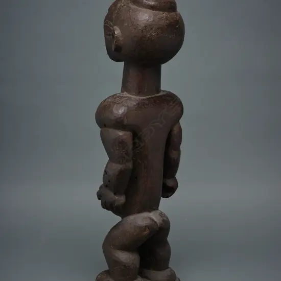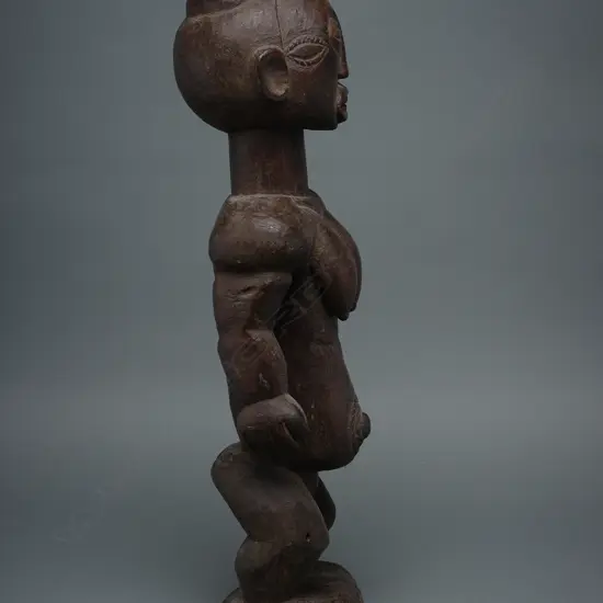 with powerful muscular body standing on a circular base, extended abdomen with scarification marks, pendulous breasts, arms free of the body, broad shoulders support long neck and enlarged head, arched brows and coffee bean eyes with facial scarification, hardwood with encrusted patina. H.60cm Acquisition/Prov.: John Cordy Limited, 2005, sale N07, lot 107
