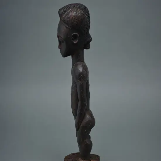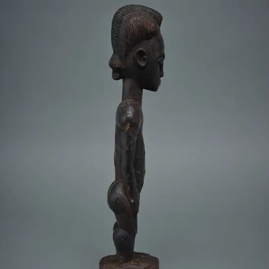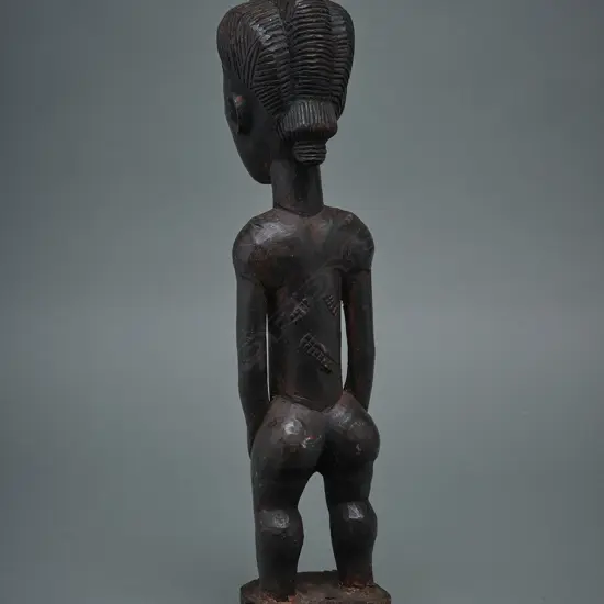 with pronounced facial features and scarification to torso. H.37cm Cat. Note/Ref.: Like this piece, Baule statues are usually carved standing on a base with legs slightly bent and their hands resting on their abdomen in a gesture of peace. Their elongated necks support a face with raised scarification marks and bulging eyes. The coiffure is very detailed and is divided into plaits. Baule statues were carved for two purposes: the first was to incarnate a spirit of the bush, Asie Usu; the second was to represent a spouse from the other world, Blolo Bla or Blolo Bian. The Baule believe every person has such a spouse, who is responsible for practical and spiritual problems that arise in life. Carved under the direction of the village diviner, such statues are kept in a person's room and rubbed on the owner's skin, giving them a shiny patina (Bacquart, The Tribal Arts of Africa, 1998). Acquisition/Prov.: John Cordy Limited 8/18/2020