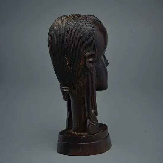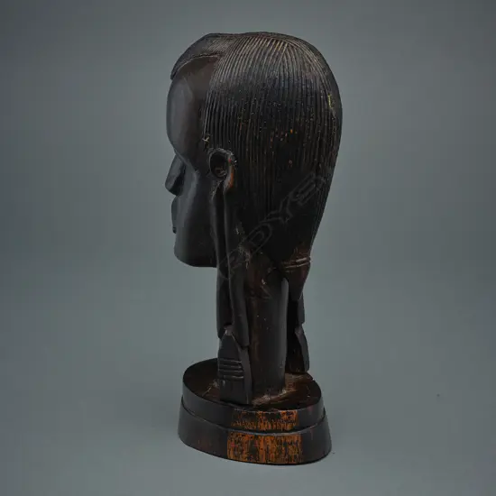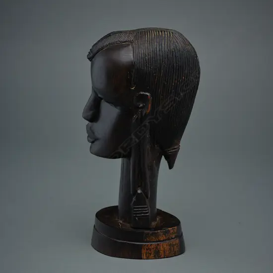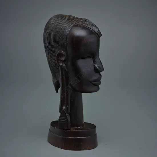 carved ebony, her extended ear lobes and earrings nearly to the oval base. H.22cm