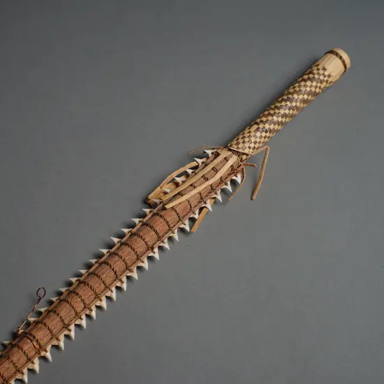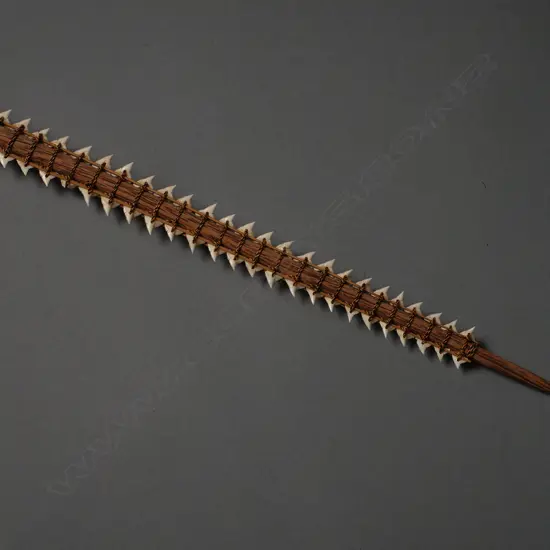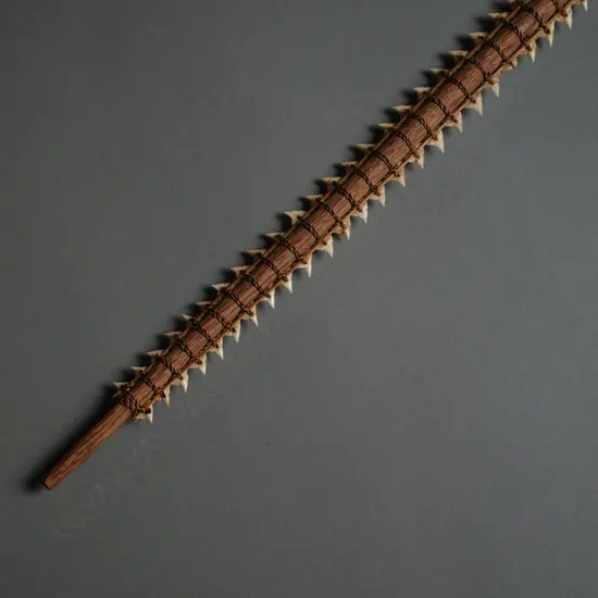 long tapered form with two finely bound rows of small shark’s teeth. Plaited fibre grip. L.82cm