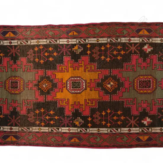 black ground, central orange medallion, plain, stitched tassels. 210 x 108cm Acquisition/Prov.: Talk of Turkey Carpets, 3.11.2002