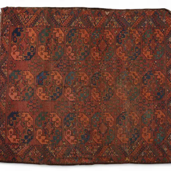 eighteen main güls, hooked diagonal border, plain tassels. 230 x 201cm