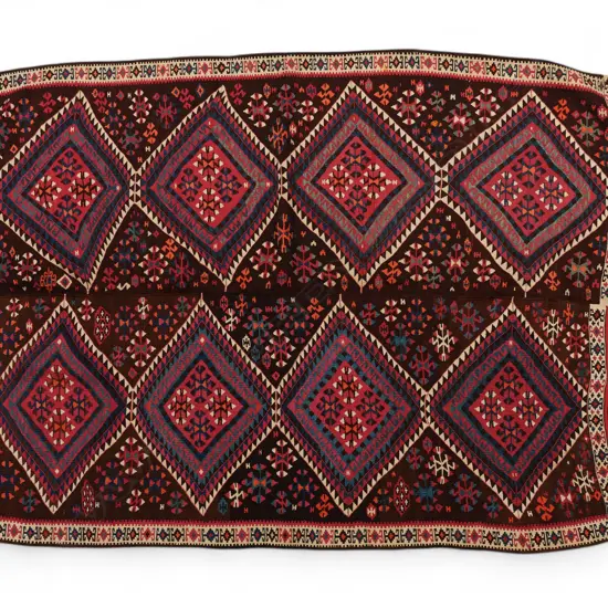 two-part, four pink diamond lozenges, oversize tassels. 208 x 160cm Cat. Note/Ref.: Rectangular leather tag attached to corner, inscribed in black ballpoint: 'VAN KILIM /$2600 / 3137 2050 x 1530'.