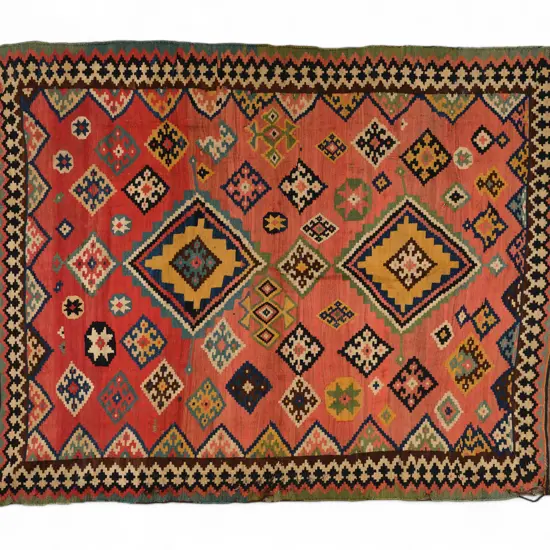 madder abrash field two stepped medallions in centre, semi-baluster inner border. 251.5 x 180.5cm