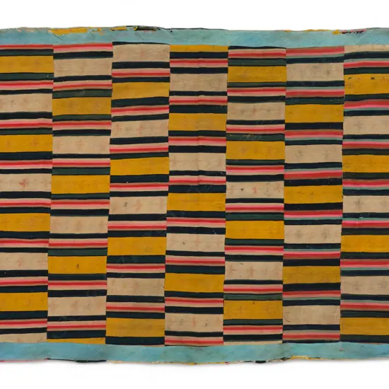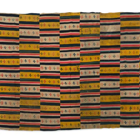 narrow polychrome woven strips, stamped with cross pattern, underside edged with cotton strip. 231 x 122cm