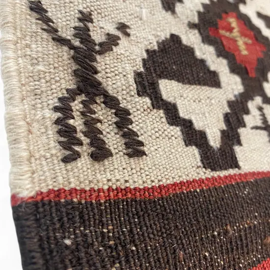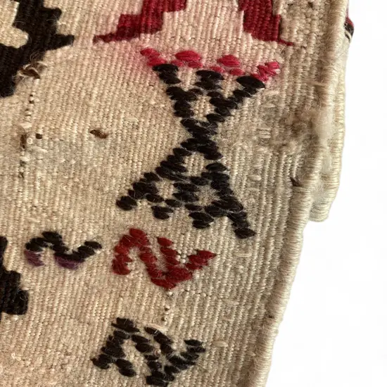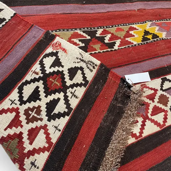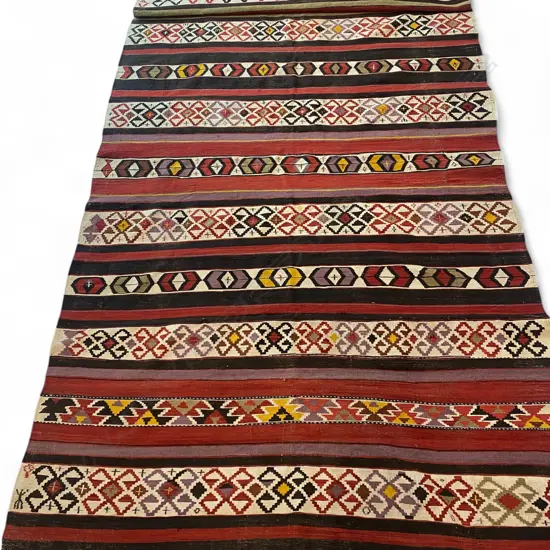 flatweave, signed and dated llc?, broad stripes, pattern on white ground. Six hanging loops attached to one side. 306 x 180cm