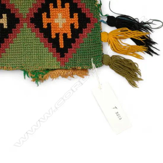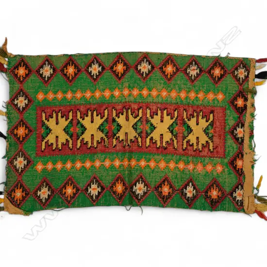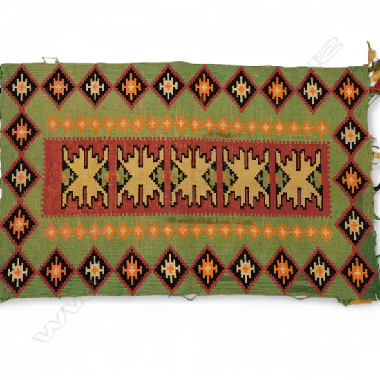 green field, red central field, with 5 stepped star motifs, coloured, knotted tassels 116 x 71cm