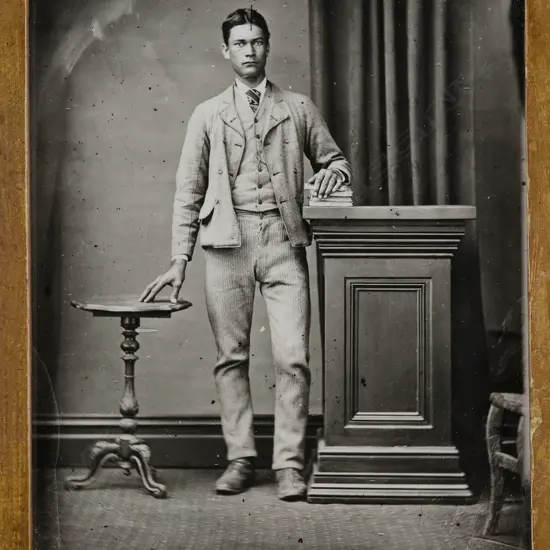 Cat. Note/Ref.: In a post on his @nzartcurator Instagram account dated 14 October 2021 Ron noted: This is a portrait that shares its mystery. From the early 1870s. Probably his first studio visit. Is he a student? I can't believe I found it decades ago. Once seen never forgotten.’ Origin/Date: c.1870 Title: ‘Unidentified portrait of a man’ Dimensions: 8.8 x 7.5cm