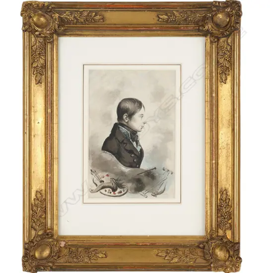 Cat. Note/Ref.: framed Inscription: Painted in black under shoulder: 'F Cuviard'. Origin/Date: France, c.1820? Title: 'Portrait of an artist' Medium: ink/gouache on paper Dimensions: 16 x 10.2cm