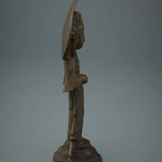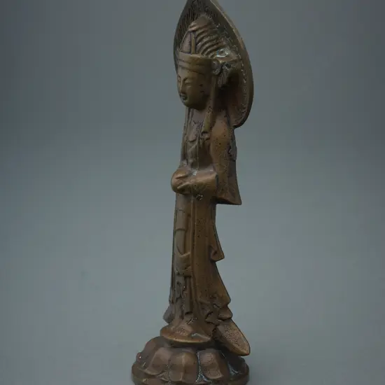 Brass standing figure of Buddha holding peach on lotus base - Tibet/China?,