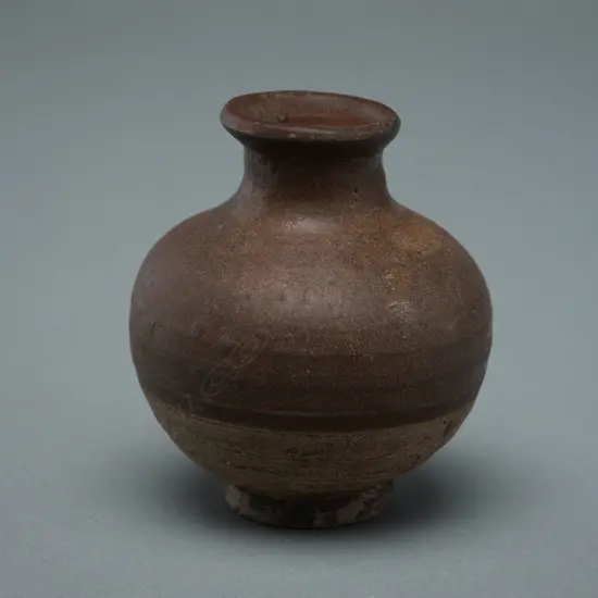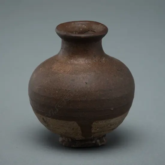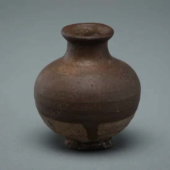 small jar of greyish buff clay. The flat base marked with striations, short flared foot, globular body with a short neck and wide mouth. Outer body and inner rim with a thick brown glaze. Origin/Date: Asia Southeast Asia, c.1400 - 1501 Medium: Stoneware Dimensions: H.7.4cm. Dia.6.6cm