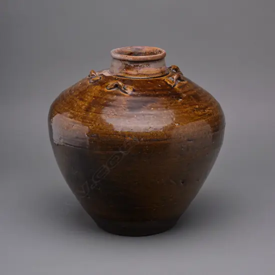 body of a reddish-brown clay, fired dark brown around the un surfaces on the base and lower body. Flat base, flaring cylindrical walls, sloping shoulder, an articulated neck and thick ring lip. The shoulder set with five lug handles, four horizontal and one vertical. The wall and shoulder with a clear olive brown glaze. Cat. Note/Ref.: Loss of glaze around rim, neck and shoulder. The attribution is based on the sale catalogue. Origin/Date: Japan Shiga Shigaraki, c.1800 - - 1868 Medium: Stoneware Dimensions: H.30.4cm. Dia.29.5cm