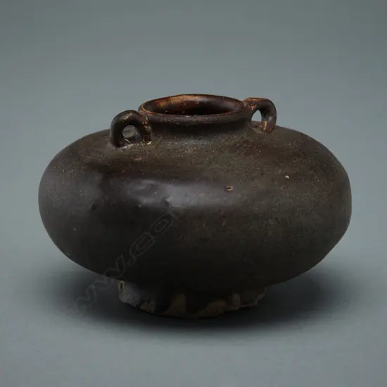 miniature bottle of greyish brown clay. Slightly domed base; the squat ovoid body set on a low integrated foot; wide shoulder with a wide, everted, mouth. Two ring handles set opposite from shoulder to lip. The exterior body and mouth with an opaque brown glaze. Acquisition/Provenance: Cordy’s Antique Auction,17 July 2007, lot 193 Cat. Note/Ref.: The type does not appear in the observed literature although the clay and glaze match an elephant figure illustrated in Dick Richards, South-East Asian ceramics: Thai, Vietnamese, and Khmer (Kuala Lumpur: Oxford University Press, 1995), pl. 65. Origin/Date: Thailand Sawankhalok, c.1350 Medium: Stoneware Dimensions: H.5.3cm. Dia.8.4cm