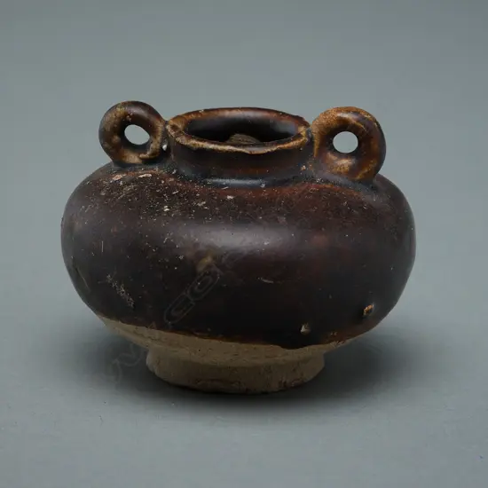 miniature bottle of greyish brown clay. Slightly domed base; the squat ovoid body set on a low integrated foot; wide shoulder with a wide, everted, mouth. Two ring handles set opposite from shoulder to lip. The upper exterior body and mouth with an opaque brown glaze. Origin/Date: Thailand, Sawankhalok, c. 1350 Medium: Stoneware Dimensions: H.5.1cm. Dia.7.1cm