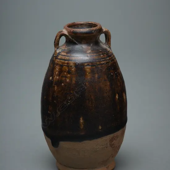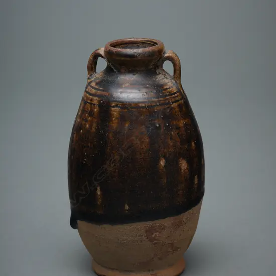 Reddish-buff clay, indented base, elongated ovoid but short neck, everted rim. Ring handles set opposite rising from the shoulder to the neck. Decorated with four incised bands around the shoulder. The upper body and rim with a dark brown glaze. Cat. Note/Ref.: Cf: William Willetts, Ceramic art of Southeast Asia (Singapore: Southeast Asian Ceramic Society, 1971), p. 61, no. 222. (University of Singapore collection). Origin/Date: Thailand Sawankhalok, 1300 - 1401 Medium: Stoneware Dimensions: H.12.3cm. Dia.7.3cm