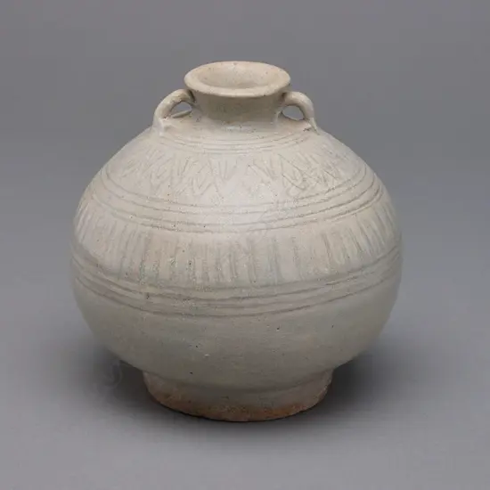 ring-necked bottle of pale greyish-buff coloured clay. Flat inset base with a dark brown circular spur; integrated foot ring, squat globular body with a short neck and everted rim; two rings set opposite rising from the shoulder to the neck. The shoulder incised with bands of horizontal lines, vertical stripes and pendant leaves. The upper foot ring, exterior wall and mouth with a pale white celadon glaze. Material: Stoneware Origin/Date: Thailand Sukothai Sawankhalok, 1200 -1601 Cat. Note/Condition/Ref.: "Cf. William Willetts, Ceramic art of South-East Asia (Singapore: Southeast Asian Ceramic Society, 1971), p. 69, no. 273 (University of Singapore collection). Roxanna M Brown, The ceramics of South-East Asia: their dating and identification (Kuala Lumpur: Oxford University Press, 1977), pl. P, no. 1 (Frank and Pamela Hickley collection). Dick Richards, South-East Asian ceramics: Thai, Vietnamese, and Khmer (Kuala Lumpur: Oxford University Press, 1995), p. 133, fig. 84 (Art Gallery of South Australia collection, 7811C80)." Dimensions: H.14.3 cm. Dia.13.6 cm