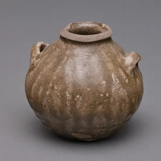 small jar with a reddish brown body. Of squat globular form with a flat, striated, base, sloping shoulder and everted rim. Two horizontal lug handles set opposite on the shoulder. The exterior dipped in a streaky brown glaze, pooling under the base . Cat. Note/Ref.: The attribution to Vietnam is highly tentative. Neither horizontal lug handles nor striated bases appear to be found in Thai ceramics but are found in early Vietnamese wares. See: Roxanna M Brown, The ceramics of South-East Asia: their dating and identification (Kuala Lumpur: Oxford University Press, 1977), pl. 3. Origin/Date: Vietnam, c.1250 Medium: Stoneware Dimensions: H.8.5cm. Dia.9.3cm