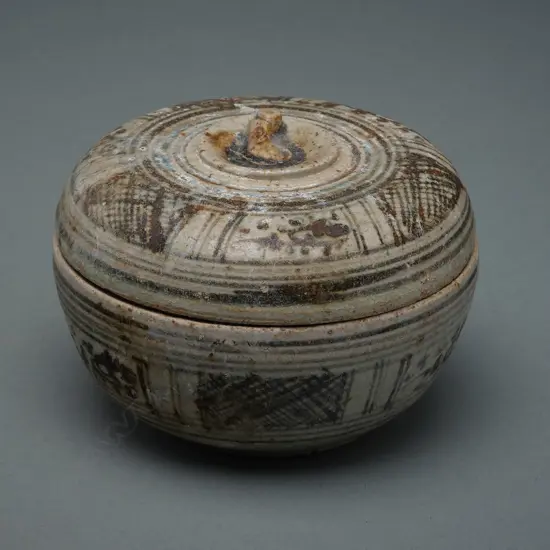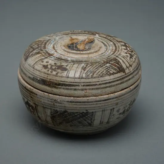 greyish buff-coloured clay. Indented base, integrated foot ring with a circular spur mark; a relief moulded ring around the lower, curving, wall; Turned rim. Flat cover with a stem knop set on a raised disc. The exterior of box and cover each painted with a band of alternating panels of cross hatching and scrolled 'fern' motifs. The box glazed on interior and exterior excluding the base, resting surface and rim; the cover on the exterior. Medium: Stoneware Origin/Date: Thailand, Sawankhalok, 1200 to 1601 Cat. Note/Condition/Ref.: "Cf. William Willetts, Ceramic art of South-East Asia (Singapore: Southeast Asian Ceramic Society, 1971), p. 57, nos 195-196 Dick Richards, South-East Asian ceramics: Thai, Vietnamese, and Khmer (Kuala Lumpur: Oxford University Press, 1995), pp. 99-100, figs 41-42. Dimensions: H.8.9cm. Dia.12.4cm