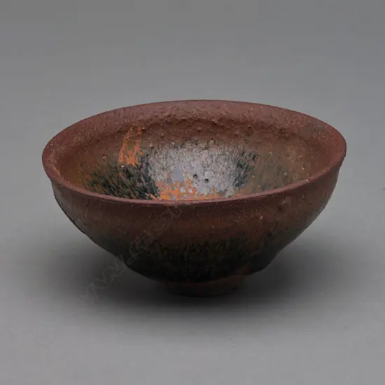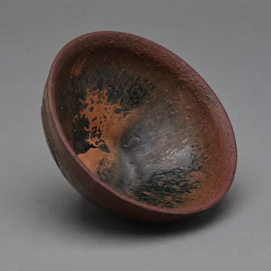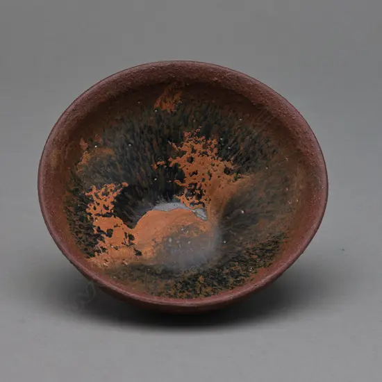 dark brown fired clay. Raised on an indented base with an integrated foot ring. Flaring conical walls with a slightly everted lip. The middle exterior walls and cavetto with a streaky oil spot glaze. The lip un. A ground-down kiln imperfection on the exterior upper wall. The interior with a thin tan slip? deposit. Origin/Date: Japan, Medium: Stoneware Dimensions: H.5.7cm. Dia.12.1cm