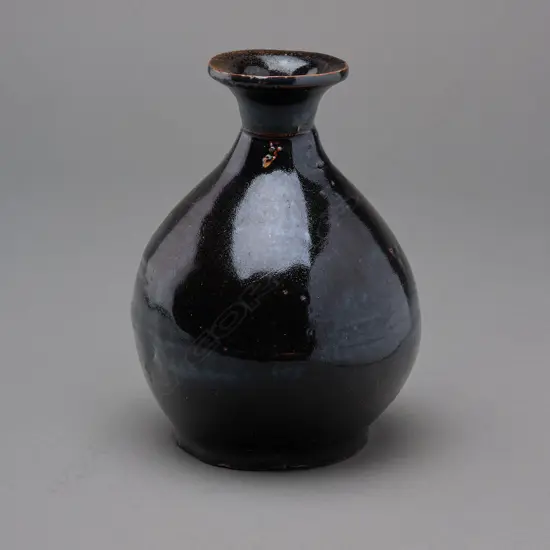 pyriform shaped bottle of buff coloured clay. Flat, indented base, integral foot ring, globular body, short neck with a narrow mouth and an everted rim. Excluding the resting surface, covered in a thick black glaze. Material: Stoneware Origin/Date: China Guangdong, late 19thC Dimensions: H.16.7cm. Dia.12.2cm