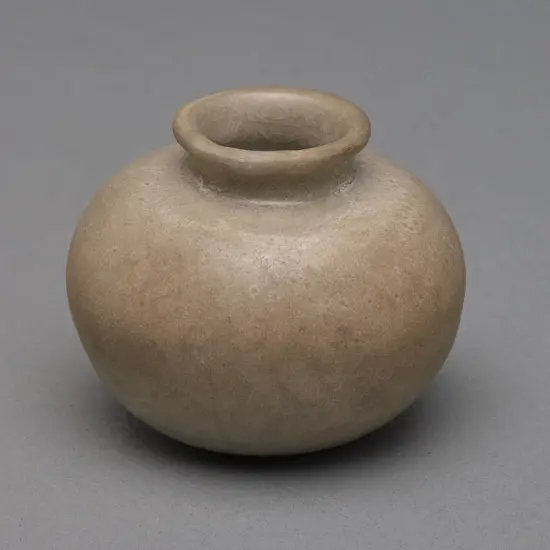 A miniature jar with a reddish brown body. Of squat globular form with a slightly domed base, wide shoulder, short neck and everted rim. The upper part dipped in an opaque celadon glaze. Cat. Note/Ref.: Very Good. Origin/Date: Thailand Sawankhalok, 1400 - 1501 Medium: Stoneware Dimensions: H.5.75cm. Dia.6.9cm