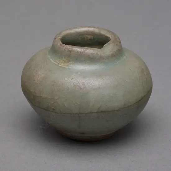 A miniature jar with a reddish brown body. Of squat globular form with a slightly domed base, an indented band around the lower wall; a wide short, roughly formed, neck. The upper part dipped in an opaque celadon glaze. Cat. Note/Ref.: Very Good. Origin/Date: Thailand Sawankhalok, 1400 - 1501 Medium: Stoneware Dimensions: H.4.4cm. Dia.5.6cm