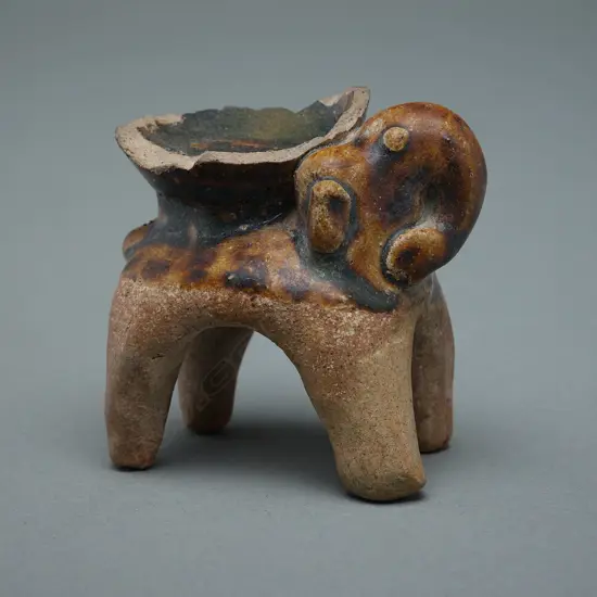 hand modelled elephant figure in pale brown stoneware. The elephant carries a ritual bowl on its back. The upper part dipped in a brown glaze. Cat. Note/Ref. For a comparable example see William Willetts, Ceramic art of Southeast Asia (Singapore The Southeast Asian Ceramic Society, 1971), p. 70, no. 280 (University of Malaysia collection; Willetts observes this figure 'came from the kiln site'). Upper part of bowl broken and lost (old break). Origin/Date: Sawankhalok, 1350 - 1401 Medium: Stoneware Dimensions: 6.2 x 6.4cm x 4.1 cm