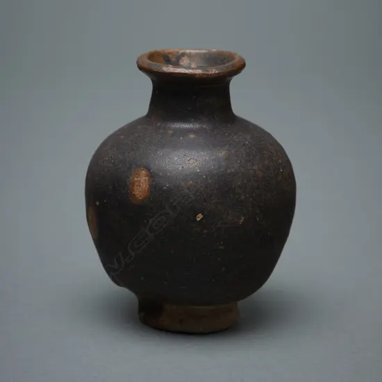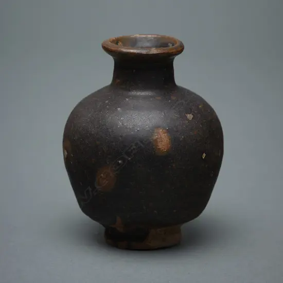 miniature jar of dark buff clay. Indented base, high integrated foot, globular body, tall neck with flanged rim. Dark brown glaze applied to the upper body and interior of the lip. Origin/Date: Thailand, Sawankhalok, 1200 - 1601 Medium: Stoneware Dimensions: H.8.1cm. Dia.6.3cm