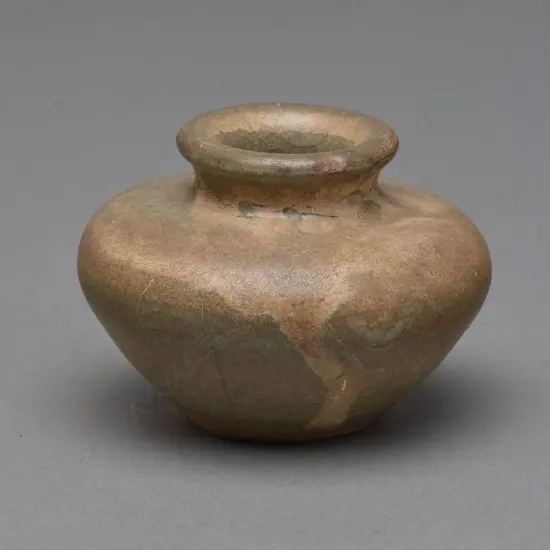 miniature jar with a reddish brown body. Of squat globular form with a slightly domed base, wide shoulder, short neck and everted rim. The upper part dipped in a brownish celadon glaze. Origin/Date: Thailand Sawankhalok, 1400 - 1501 Medium: Stoneware Dimensions: H.5.7 cm. Dia.7.7 cm