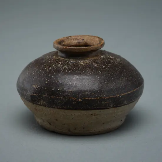 greyish brown clay. A slightly concave base, low, integrated foot, a squat ovoid body, short neck with an everted rim. The upper body and rim with a dark brown glaze. Cat. Note/Ref.: Very Good. Origin/Date: Thailand Sukothai Sawankhalok, c.1200-1601 Medium: Stoneware Dimensions: H.6.2cm. Dia.9.4cm
