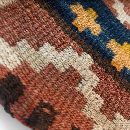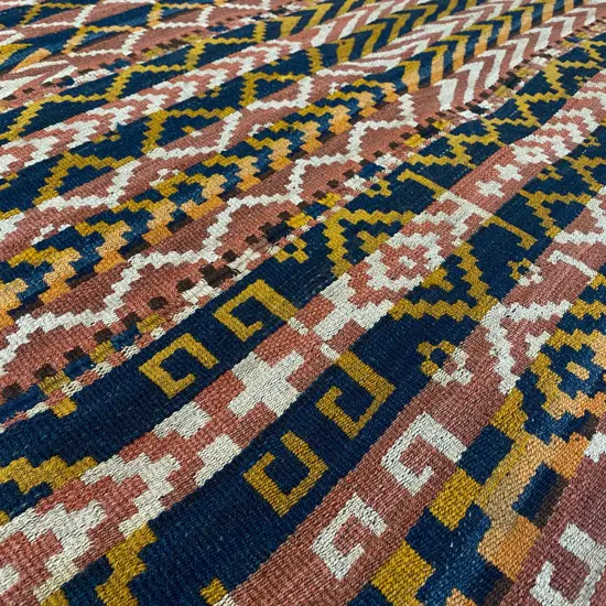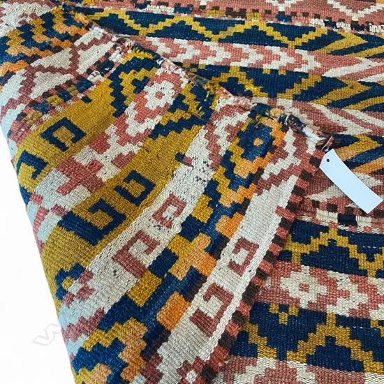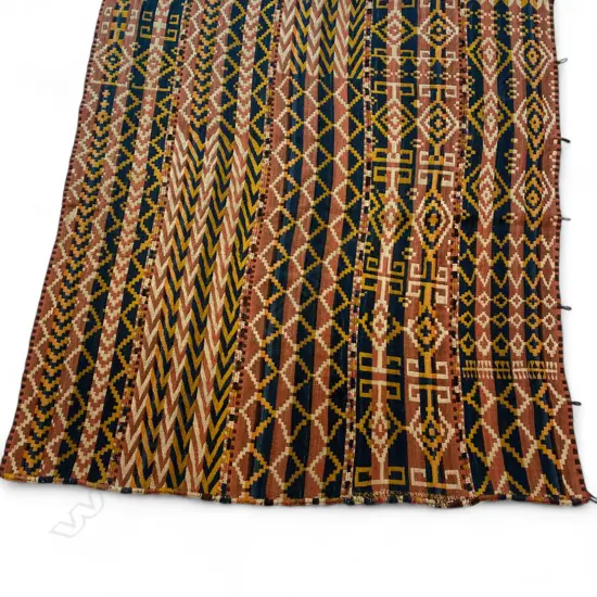 flatweave, five sections, striped with stepped diamond design and zigzag bands. Seven integrated plaited hanging loops along one side. 158 x 171cm