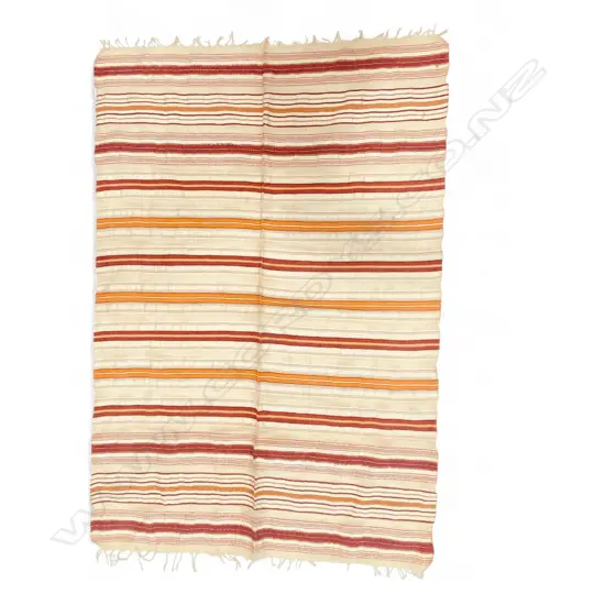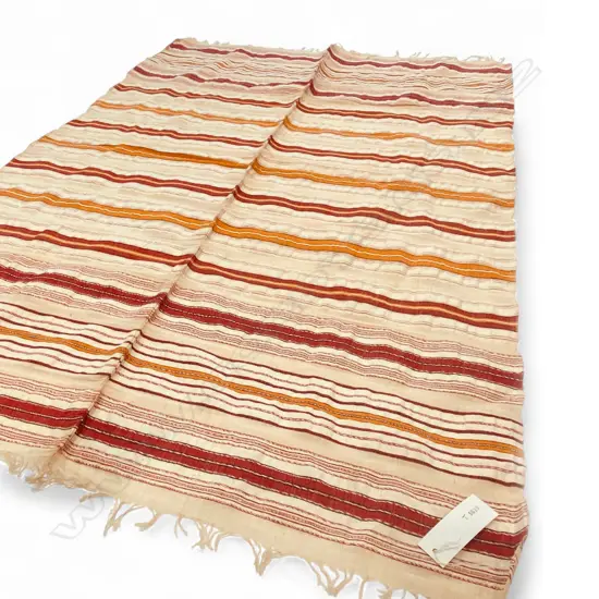 linen and cotton, woven in two parts with red orange and white bands. 144 x 97cm