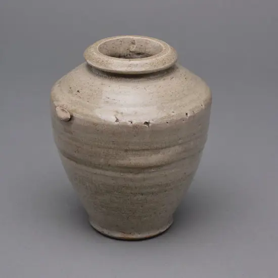 12thC to 16thC. Small cylindrical storage jar of a fine grey clay. Concave base, everted integrated footing, flaring walls, wide shoulder with a thickly potted everted rim. The neck and exterior body covered in a clear, craquelure, glaze. Chip to rim. H.16.3cm. Dia.13.4cm Origin/Date: Asia Southeast Asia, c.1100 c.1701
