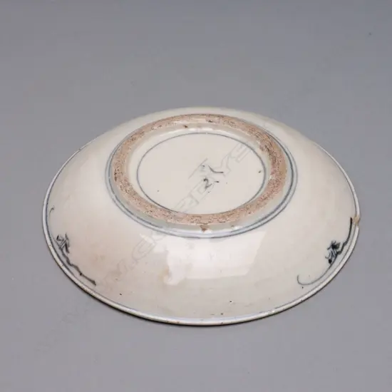 Fujian, China - c.1600. Bluish white clay. Flat indented base with an integrated foot ring; low curving wall with an everted rim. Crudely painted in cobalt blue underglaze around the lower exterior wall with a double line; around the exterior rim with three sprays surmounted by a single line; in the cavetto with a floral spray depicted on a flat surface encircled by a double line. The whole, excluding the resting surface, with a clear glaze. H.3.8cm. Dia.18.4cm. Cat. Note/Ref.: Chip to rim. Very Good. Origin/Date: China Fujian Pinghe Zhangzhou, c.1600