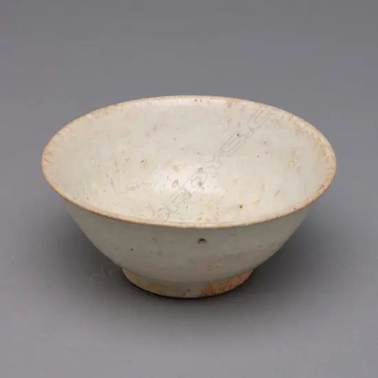 Thailand, 13thC to 16thC. Of greyish buff coloured clay. Inverted campanulate form; indented, slightly convex, base; integrated foot ring. Excluding the base, the whole covered in a vitreous white glaze. H.6.4cm. Dia.14.5cm Cat. Note/Ref.: Dick Richards, SouthEast Asian Thai, Vietnamese, and Khmer (Kuala Lumpur Oxford University Press, 1995), p. 123, fig. 72 (Art Gallery of South Australia, 776C23). Loss of glaze to rim; surface dirt. Good. Origin/Date: Thailand Sukothai Sawankhalok, c.1200 c.1601