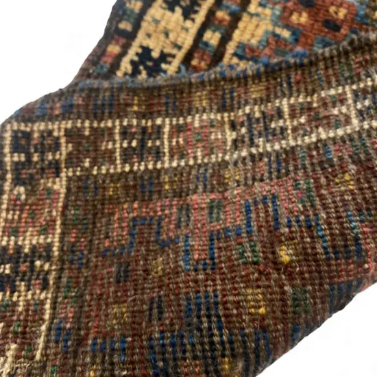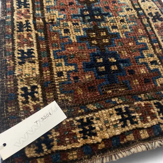 Bag face - wool - pile,- coarsely woven blue/green white border - woven tassels. 37 x 82.5cm