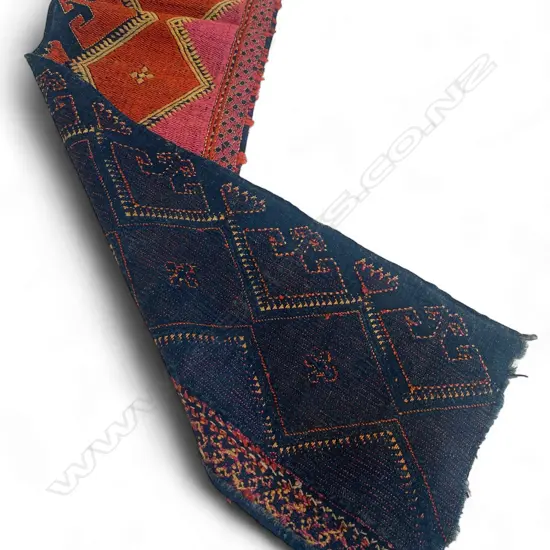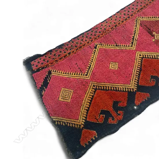 Textile band - cotton/silk embroidery,- Uzbek - black ground - pink and orange decoration. 189 x 17.5cm