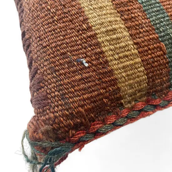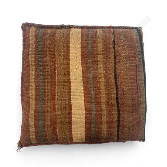 Cushion – wool, - flatweave/embroidery - alternating indigo/cream bands - stepped diamonds with crosses/A-patterns.52.5 x 51cm