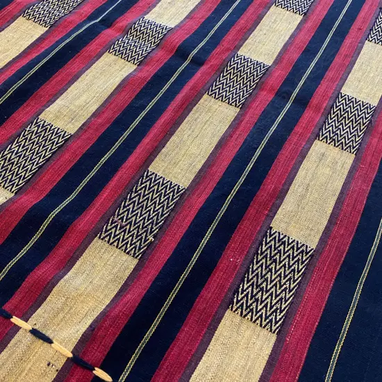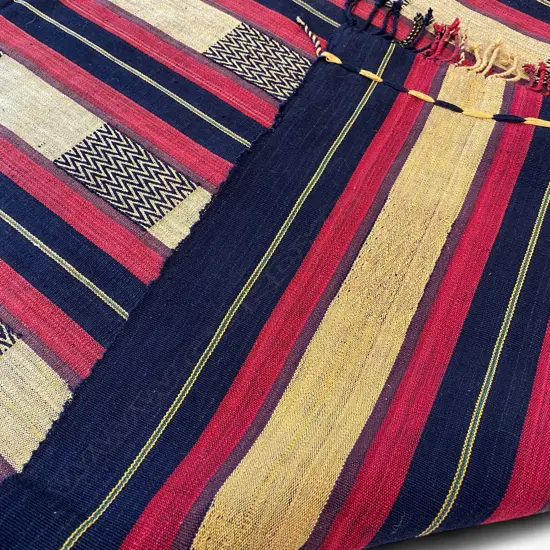 plain weave - Naga - red/navy blue/yellow alternating stripes yellow with 7 zigzag panels - twisted tassels. 117 x 105cm