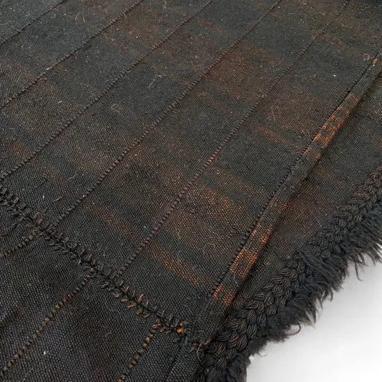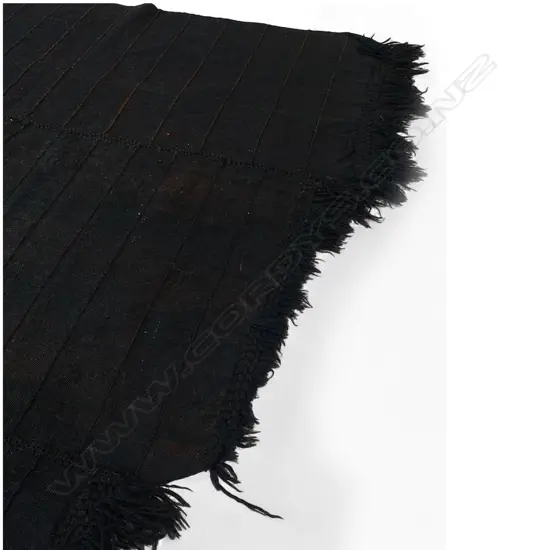 – three-part construction - raised embroidered horizontal bands - intense black flecked orange - braided tassels at base. 215 x 138cm