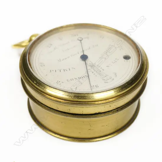 in 2" diameter lacquered brass circular case with screw-off glass front and engraved silvered dial, with Trademark miner's lantern. Blued steel hand with adjustment keyhole at 33". Maker: James Pitkin and Thomas W Short (of Marrat & Short, later Short & Mason), c.1870. Provenance: Ex Cordy's 2015. Removable brass back cap, which protects a porous tile, which is introduced to the suspected atmosphere, when, in about 45 seconds, the maximum effect is produced; the barometer reading indicates fire damp. Subsequently because the maximum point having been reached, effusion takes place, and the hand travels back to zero. (26")