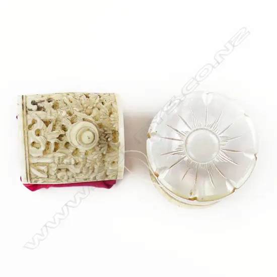 A Chinese carved ivory sewing clamp with a bone and mother of pearl bobbin spool,