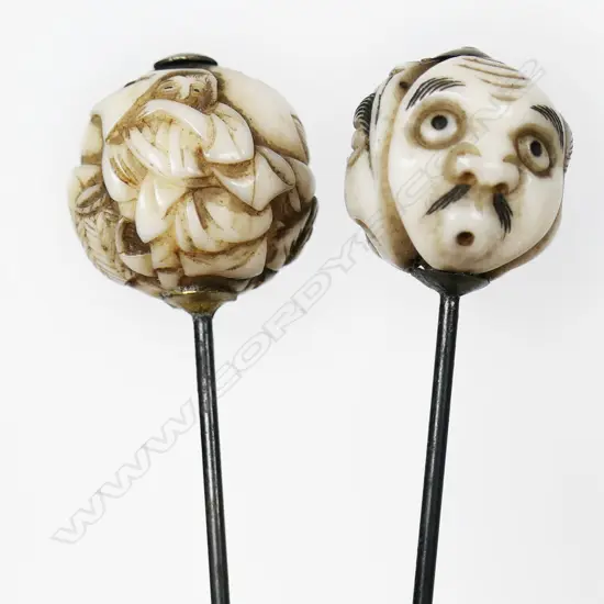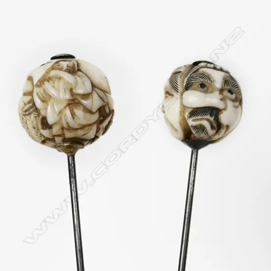 the hatpins with finials fashioned from Japanese ivory ojimi beads one carved with masks, the other with figures