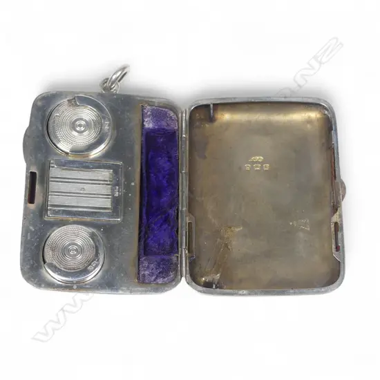An Edwardian silver combination cigarette case fitted with sovereign and half-sovereign sprung silo holders, a sprung stamp holder and a space for a small cigarette holder.