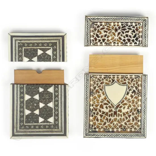 the larger of fine fretwork ivory overlaying horn panels framed and edged with engraved ivory fillets, the interior of sandalwood. Shield cartouches to either side, one floral engraved the other vacant. The smaller of saddle mosaic panels between bands and walls of ebony and ivory stringing. 95 x 65mm and 85 x 60mm