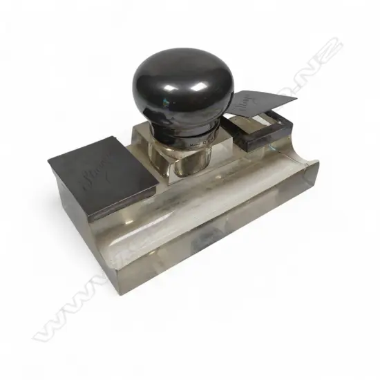 A silver and glass desk top standish with central inkwell flanked by two stamp boxes, London 1922,