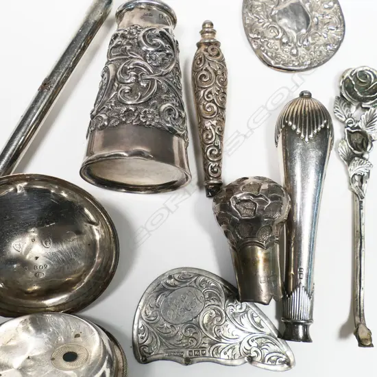 A large sterling silver Reynolds Angels button hook, Birmingham 1906 (dents) along with a silver walking cane top and other scrap silver.