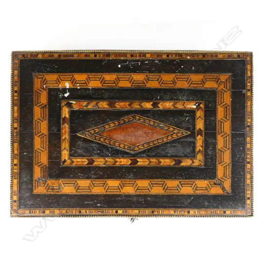 An ornate 19thC Tunbridge ware work box, with multiple chevron and ribbon bands to the top and walls. The interior with lidded compartments to a removeable top tier. The lower tier with a lift out tray flanked by drawers. With keys. 330 x 220 x 155mm